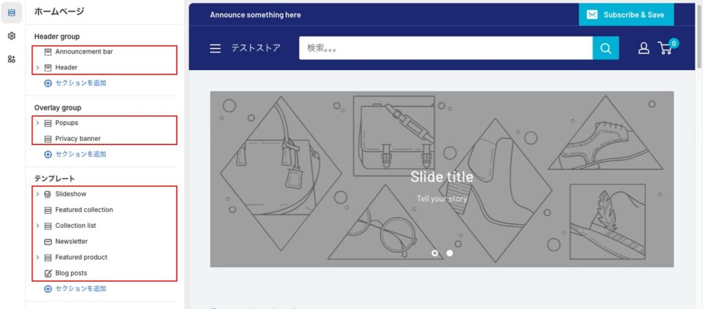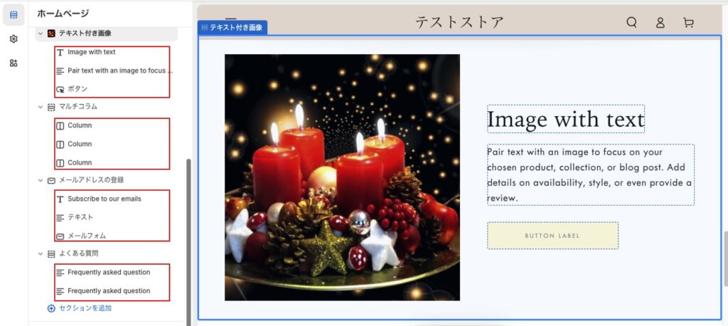 Shopifyでは、編集画面内でセクションを積み重ねて各ページの見た目を作っていきます。