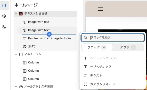 ブロックとはセクションの中に入れることができるテキストや画像、ボタンといった小さなパーツのことです。