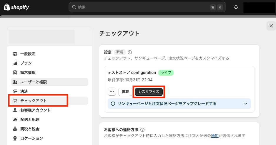 ※チェックアウトページは「設定」>「チェックアウト」>「カスタマイズ」ボタンから編集をすることができます。