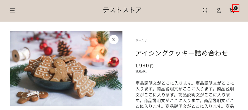 ヘッダーにあるカートのアイコンに数字が表示されますが、この裏の図形のデザインを編集する作業も工数がかかります。
