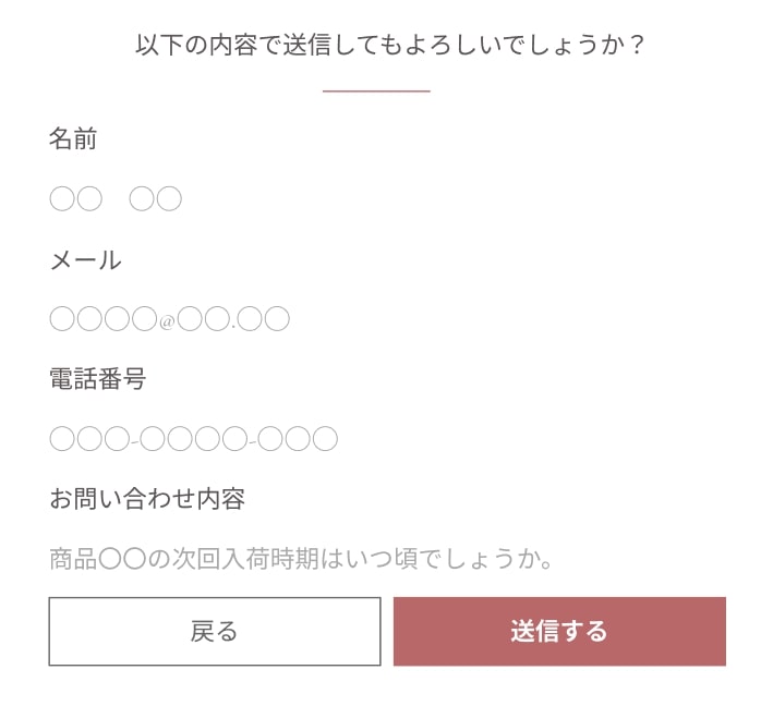 クライアントから作ってほしいと依頼が入る可能性はありますが、以下のような確認画面は外部機能を利用せずに実装することは不可能なのでデザインカンプ制作時に作らないように注意しましょう。