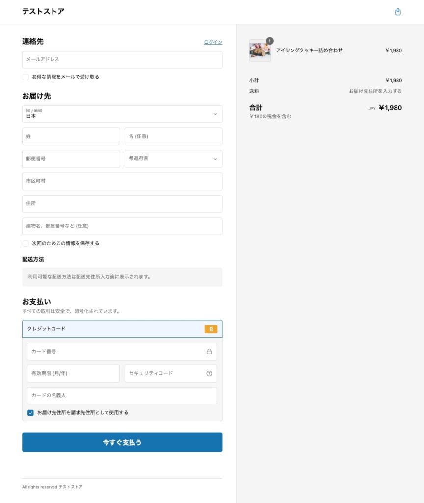 カートページを経由せずにチェックアウトページに遷移させるとラッピングの選択やお届け日時指定の設定といったようなオプションを選択することができないため、「今すぐ購入ボタン」を入れずに制作する案件が大半です。