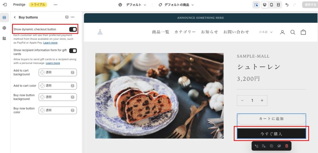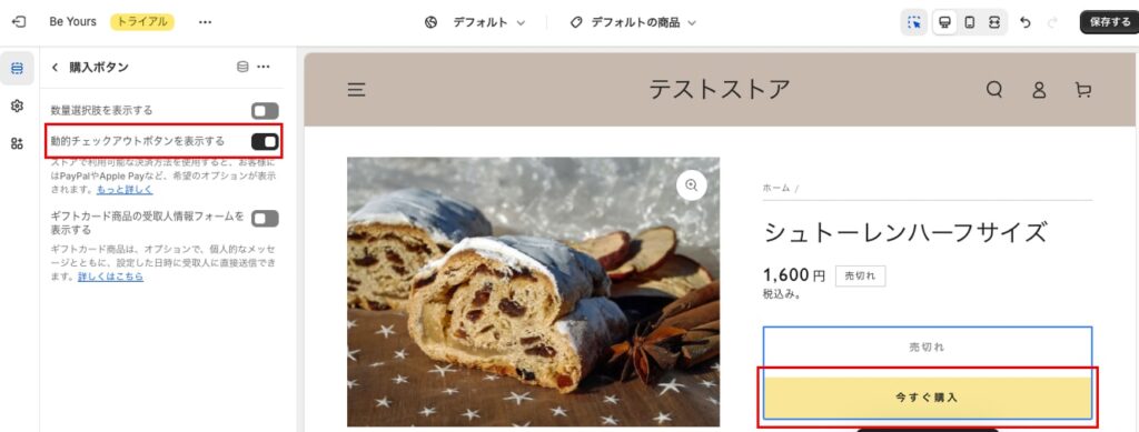 編集画面の購入ボタンのブロックの設定内「動的チェックアウトボタンを表示する」または「Show dynamic checkout button」をオンにした時に表示されるボタンが「今すぐ購入ボタン」です。