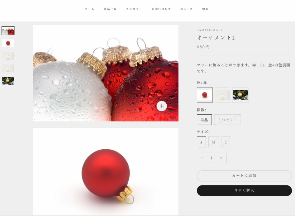 商品単体ページで表示される商品画像とその周囲の見え方も、テーマのデフォルトの形から変更しないでほしいと言われることの多い部分です。(カスタマイズ画面でできるような変更であれば、変更しても問題ありません。)