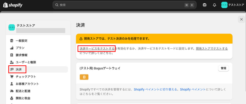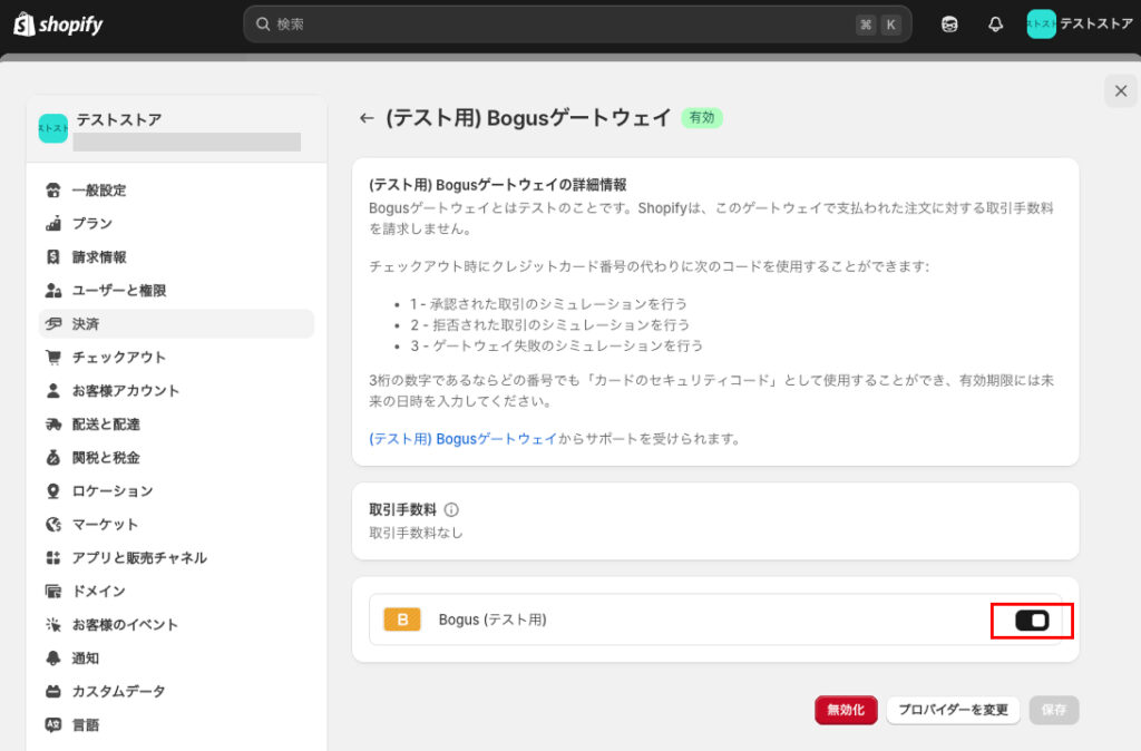テスト決済を行いたい場合は、はじめに設定画面内の決済の項目でテスト決済ができるように「Bogus(テスト用)」という項目を有効にしておく必要があります。