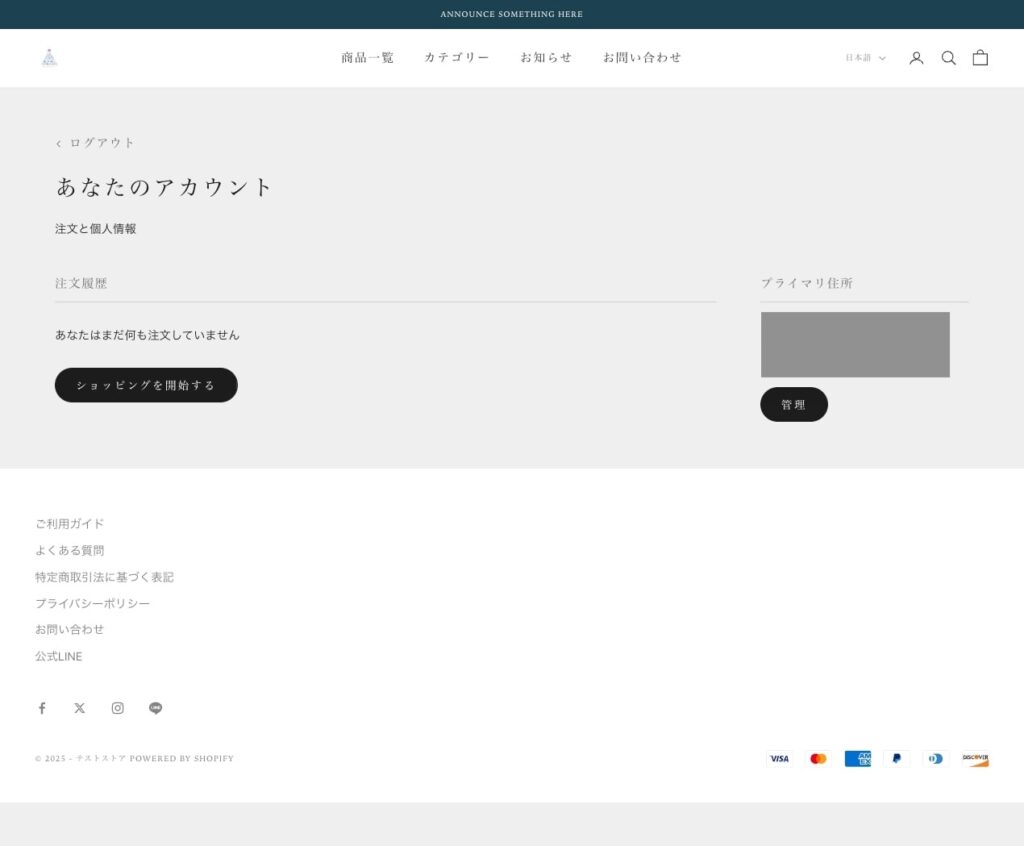 テストストアで登録したアカウント情報でログインをするとアカウント詳細ページの見た目の確認ができますが、一度もテスト決済をしていないテストストアでは購入履歴は表示されません。