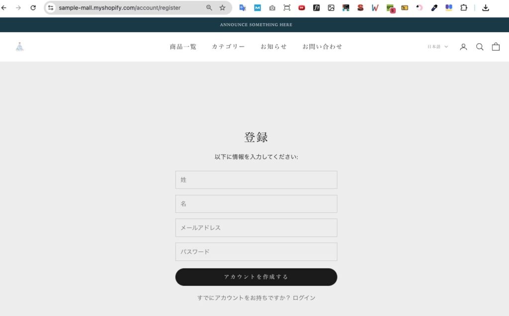 アカウント詳細ページにログインをするにはテストストア上でのアカウントの登録が必要となるため、登録のできるページ(/account/register)からアカウントを作る必要があります。