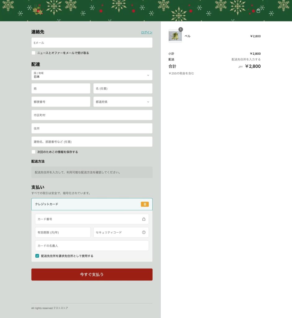 チェックアウトページはShopify の通常プランではデザインを変更できる部分は限られ、背景色やボタンの変更などしかできないようになっています。