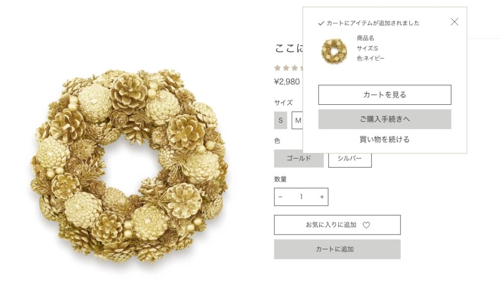 また、カートに入れるボタンをクリックした時の様子についてはテーマ既存の見た目とするケースが大半ですが、以下のようにどのような見た目のポップアップが表示されるかわかるようにデザインカンプに記載しておきます。