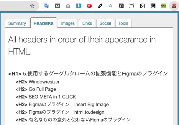 見出しは目視でも確認できるため使わなければ制作ができない拡張機能という訳ではありませんが、見出し構成が目視で確認しにくいサイトのデザインの場合は使用すると便利です。