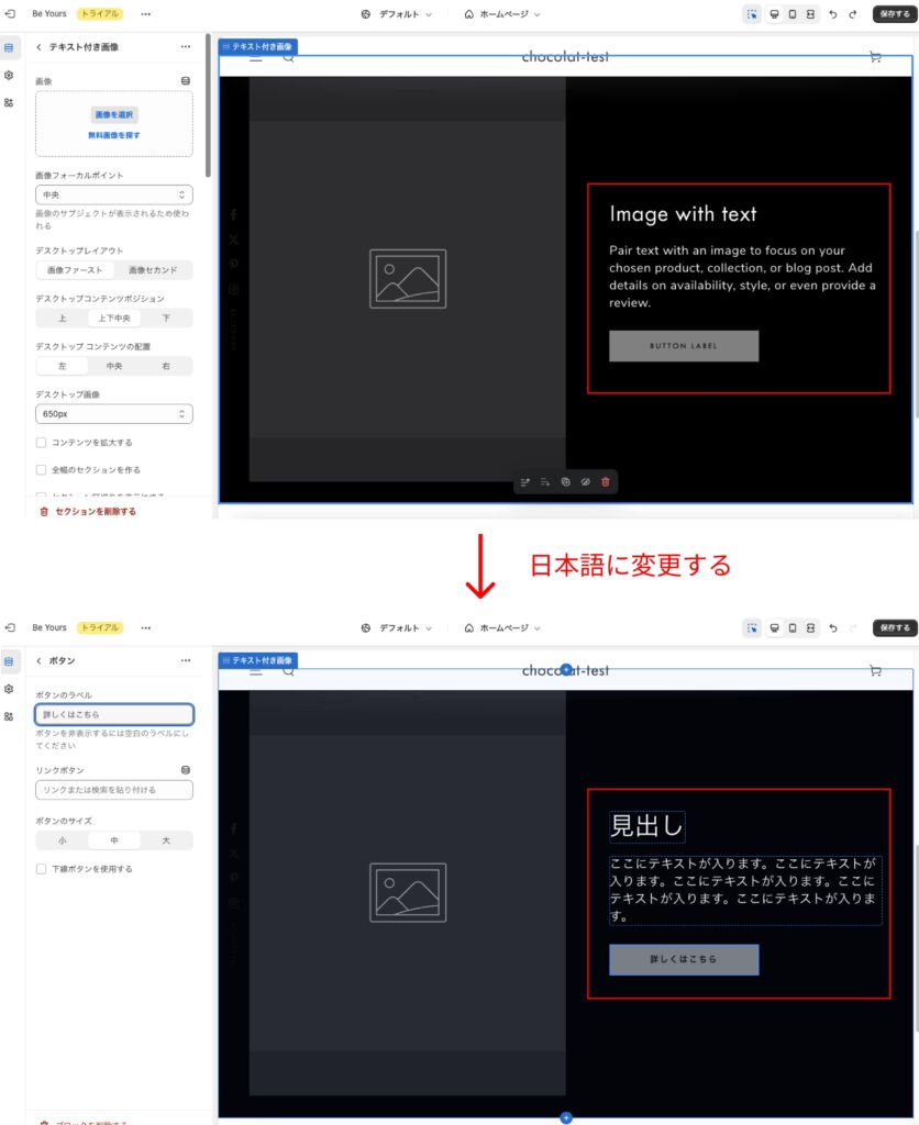 使用するセクションやブロックの中のテキストは日本語の方がワイヤーフレームを作りやすいので、ボタンの文字やテキストコンテンツは日本語に変更しておくのがおすすめです。