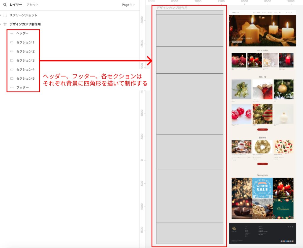 ※デザインカンプのレイヤーには、なるべくShopifyの編集画面で利用したセクション名をつけておくようにしましょう。構築時にどのセクションを利用しているのかわかりやすくなります。