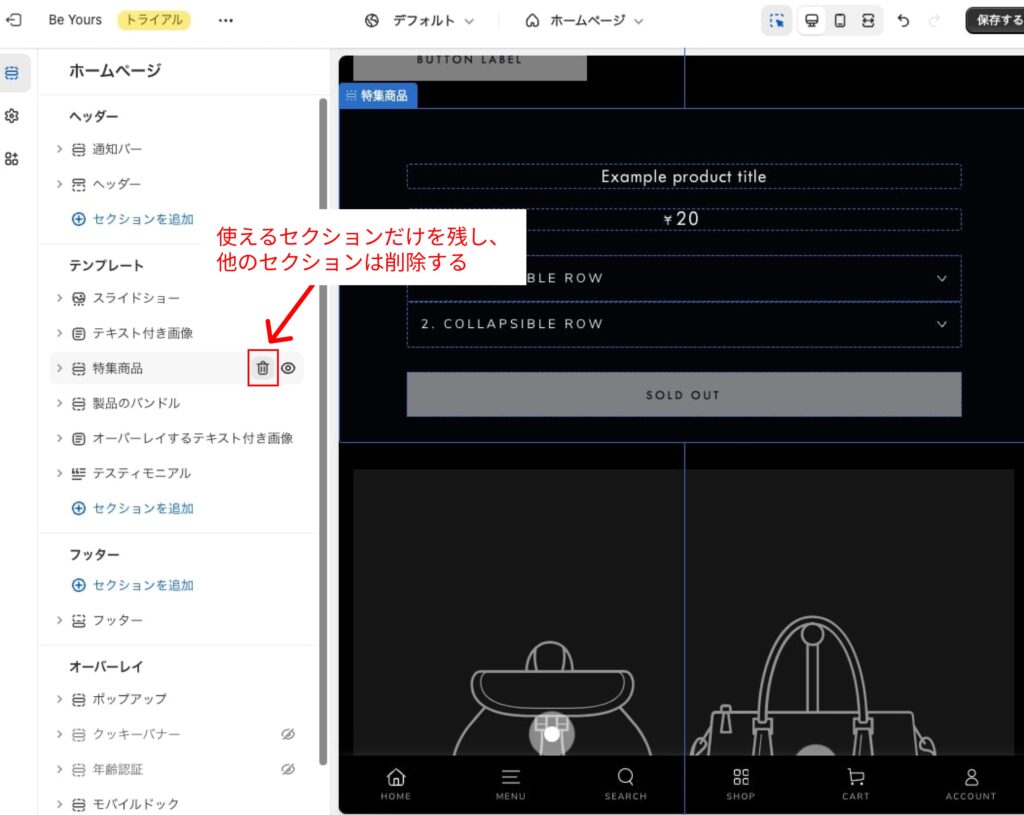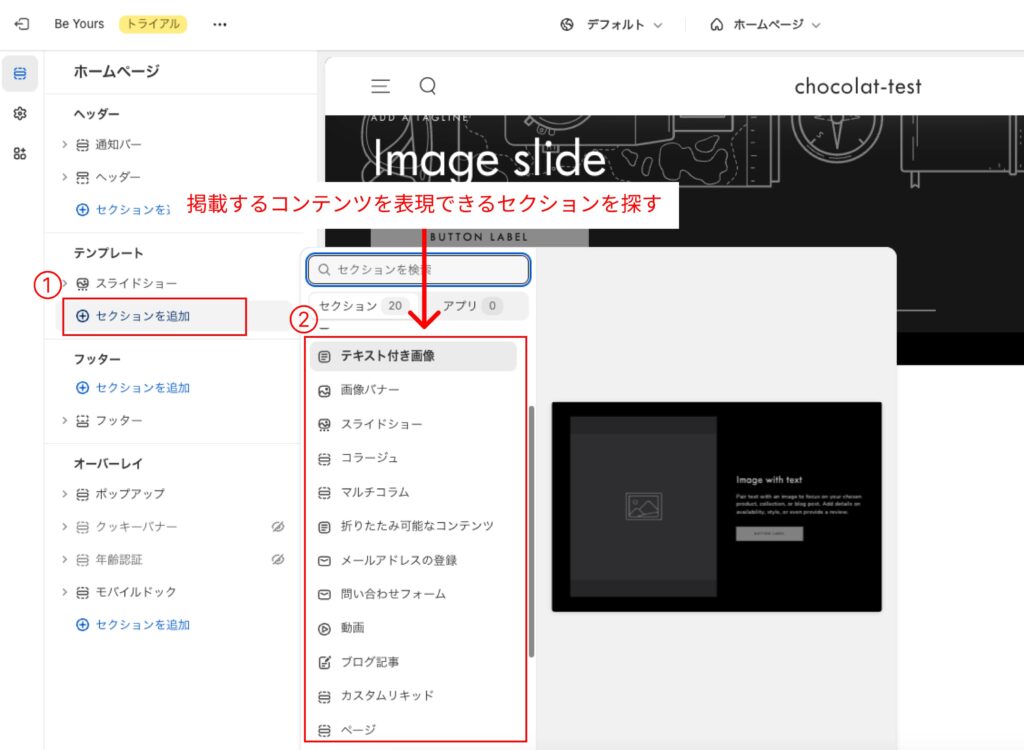 テストストアでセクションとブロックを使って構築し、完成したらプレビューモードに切り替えます。