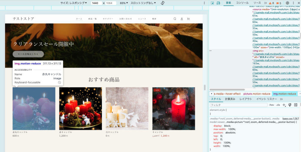 そのような案件の場合は該当箇所の見た目や値をテストストアで確認をする必要があるため、テストストアでどのような見た目だと構築可能か確認をしてからデザインカンプを制作するようにしましょう。